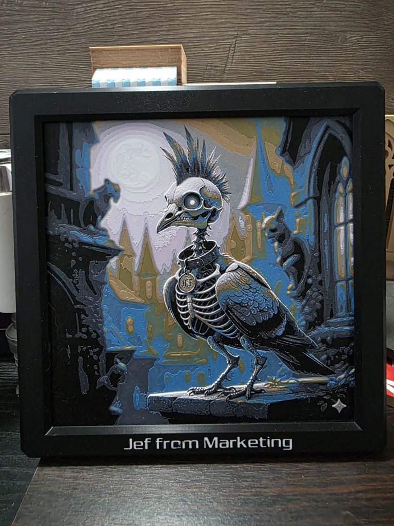 This was a bit of a commission from a friend and if I remember right, this had 7 colors. I can do up to 12 colors before I have to start getting funky with the machine. Standard size is 200x200mm.